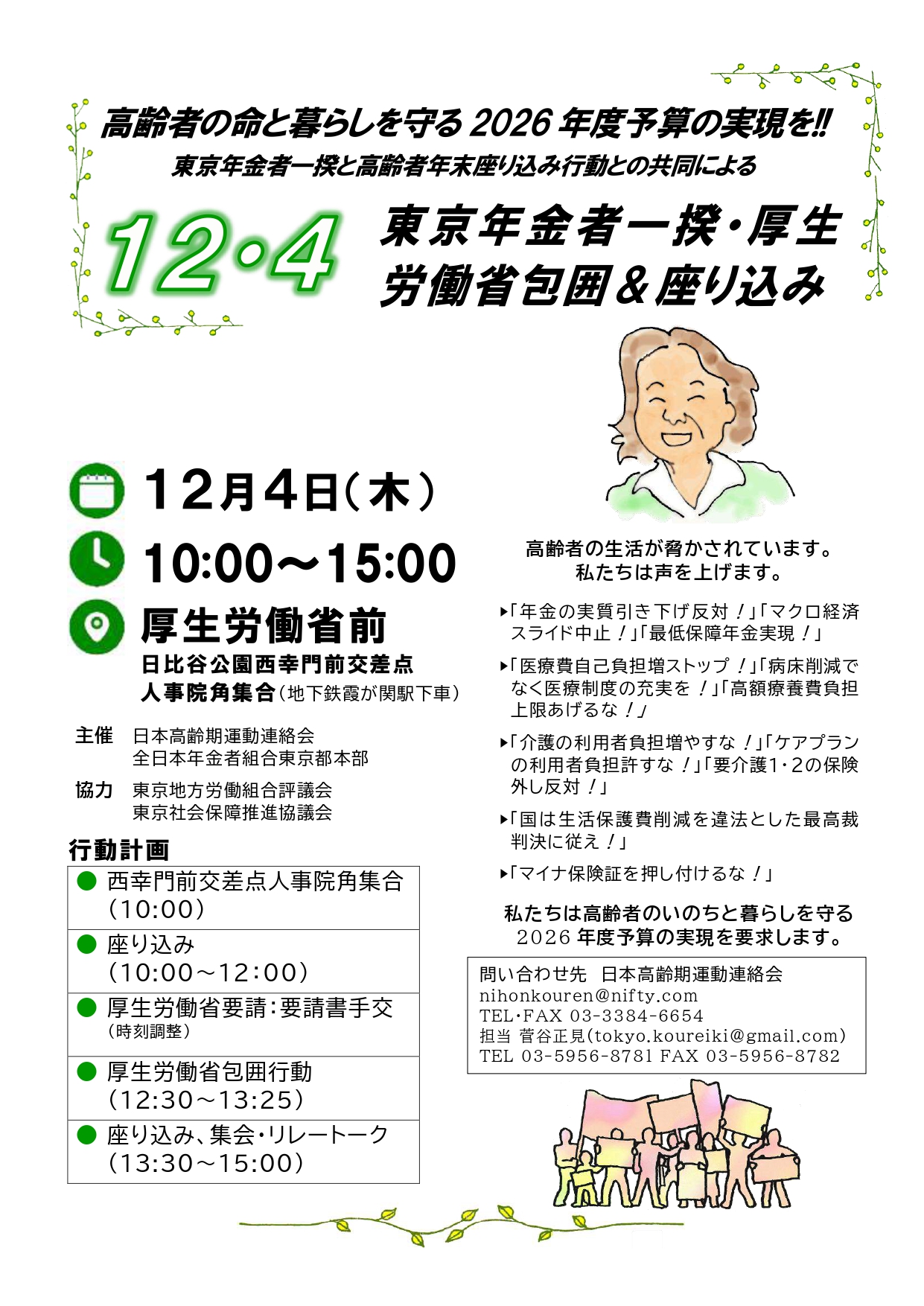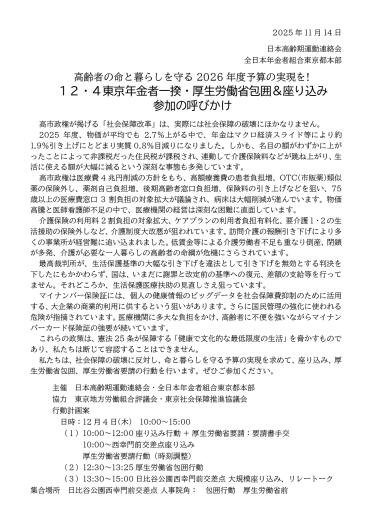 12月4日(木)10:00〜15:00 高齢者の命と暮らしを守る2026年度予算の実現を求めて、厚生労働省包囲&座り込みの行動を行います。 チラシと呼びかけは、画像をクリックするとPDFが出ます。ダウンロードすることができます。