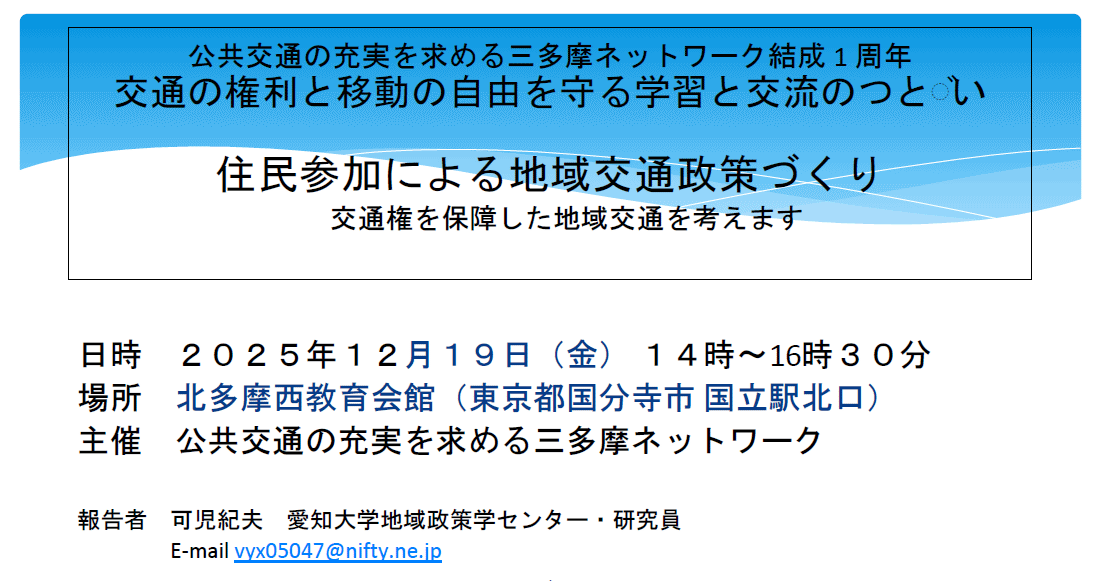 12/19公共交通の充実を求める三多摩ネットワーク 結成1周年 学習と交流のつどい、各地域から45人都議会4党7都議が参加。可児紀夫さんの講演で学習。以下から可児さんの学習資料(パワーポイントをPDF化)をダウンロードできます。 2025/12/18