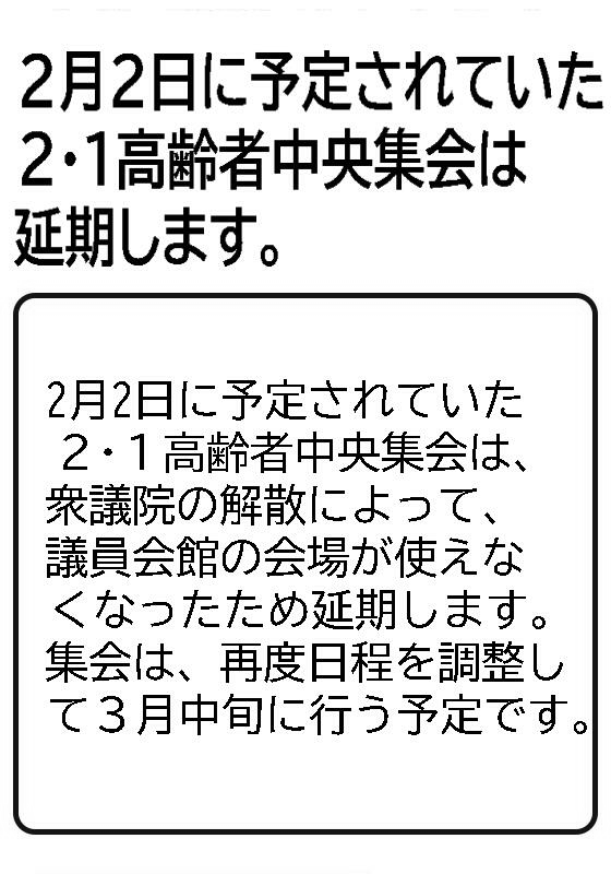 2026/01/222月2日に予定されていた2・1高齢者中央集会は、解散によって議員会館が使えなくなったため、延期することが決まりました。3月中旬に日程を調整して行う予定です。 2026/01/14