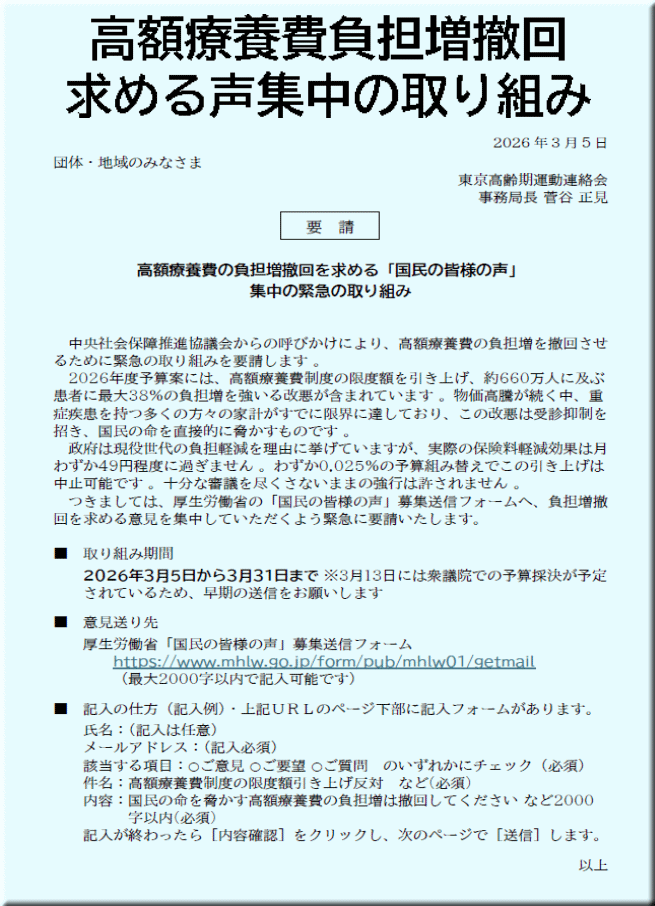 今年は、猿田佐世さんを講師に招き「戦争しない社会をどう作るか(仮題)」講演を聞き、団体の運動交流、国会議員要請を行います。 2025/12/26東京高齢期運動連絡会は12月26日付で東京都の2026年度2027年度後期高齢者医療保険料について、広域連合と東京都に、値上げを行わないこと、低所得者の保険料の値下げを行うこと、東京都は必要な財政措置を行うことを求める要請書を送付しました。要請書PDFはhttps://koureiki.main.jp/pdf/2025/2025-12-26yousei.pdf にあります。 2025/12/20