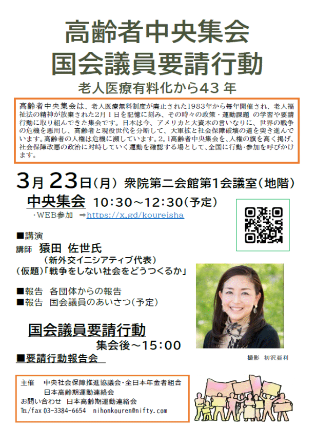 2月2日(月)10:30から衆議院第2議員会館第1会議室で、高齢者中央集会・国会議員要請行動が行われます。高齢者中央集会は、老人医療無料制度が廃止された1983年から毎年開催され、老人福祉法の精神が放棄された2月1日を記憶に刻み、その時々の政策・運動課題 の学習や要請行動に取り組んできた集会です。